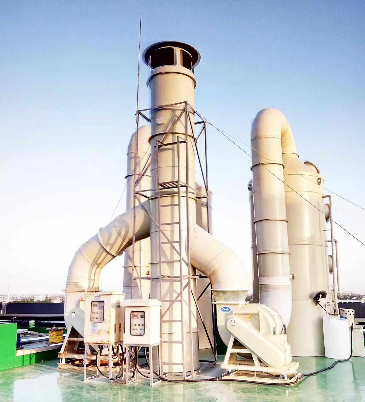 根據(jù)電子產(chǎn)品生產(chǎn)企業(yè)廢氣特點及同類廢氣噴淋塔實際運行效果,采用兩級堿液噴淋方式吸收處理電鍍廢氣處理,酸性廢氣通過設(shè)備配套管道從塔體下方進氣口沿切向進入噴淋塔,在風機的動力作用下,迅速充滿進氣段空間,在噴淋段中吸收液從均布的噴嘴高速噴出,形成無數(shù)細小霧滴與氣體充分混合、接觸,繼而被水吸收,使其達標排放。電子產(chǎn)品生產(chǎn)企業(yè)的生產(chǎn)工藝廢氣中氯化氫執(zhí)行《大氣污染物綜合排放標準》(GB16297-1996)二級標準,氯化氫z高允許排放濃度30mg/m3,z高允許排放速率0.43kg/h,排氣筒高度20m。