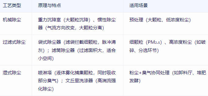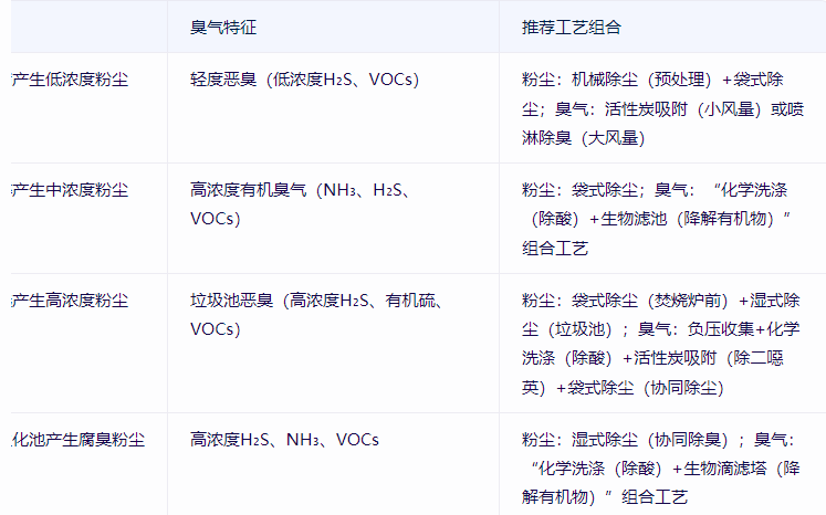 垃圾處理場景(轉(zhuǎn)運(yùn)站、堆肥廠、焚燒廠)的粉塵與臭氣特征差異大,工藝需針對(duì)性匹配: