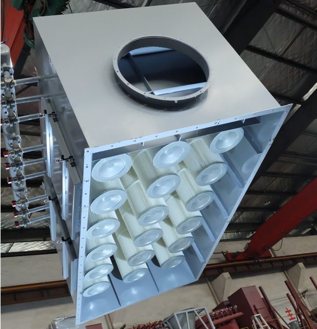 濾筒除塵設備的主要結構包括除塵室、脈沖反吹清灰系統、風管和風機。含塵空氣進入除塵室后,被圓筒形過濾筒所阻隔,亞微米以上的含塵物被阻留在濾筒外表面,過濾凈化后的氣流從濾筒中心排出。