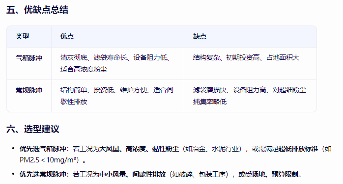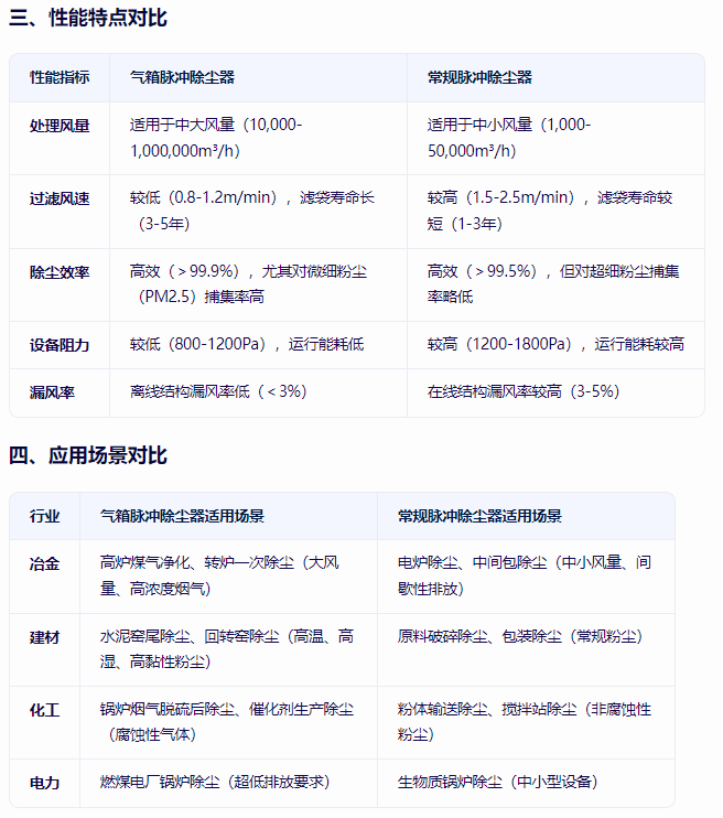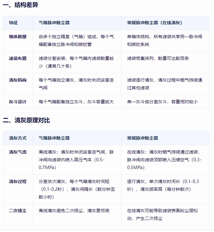 氣箱脈沖除塵器和常規脈沖除塵器(通常指在線清灰脈沖除塵器)在結構、清灰原理、性能特點及應用場景等方面存在顯著差異,以下是具體對比: