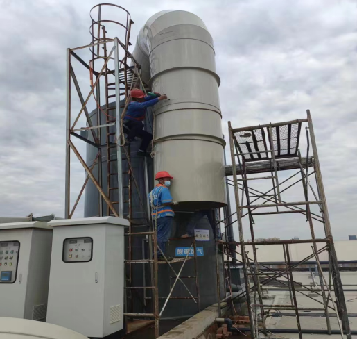 塔體放置二層填料層并配置二級高壓水浴裝置,經(jīng)二級噴淋裝置清洗后,通過濾水裝置,凈氣達(dá)標(biāo)外排。