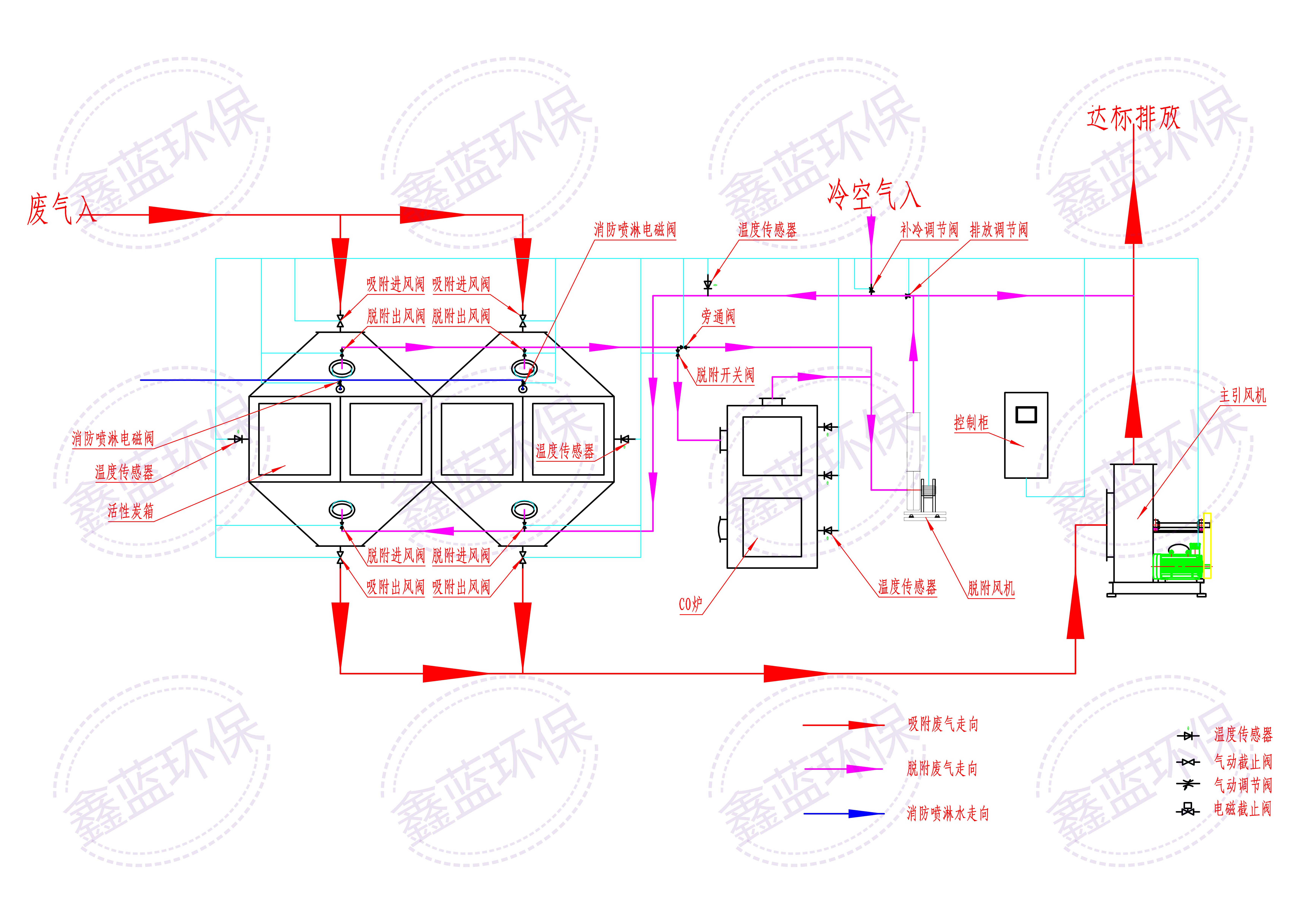 鑫藍環保活性炭吸附催化燃燒工藝采用活性炭多微孔的特性吸附有機廢氣,當活性炭吸附飽和后用熱空氣脫附再生,通過控制脫附過程流量可將有機廢氣濃度濃縮10-20倍,脫附氣流經催化床內設置的電加熱裝置加熱至250℃左右,在催化劑作用下起燃,催化燃燒過程凈化效率達97%以上,燃燒后生成CO2和水并釋放出大量熱量,該熱量通過催化燃燒床內的熱交換器一部分再用來加熱脫附出的高濃度廢氣,另外一部分加熱室外來的空氣做活性炭脫附氣體使用,達到熱平衡后關閉電加熱裝置,這時再生處理系統靠廢氣中的有機溶劑做燃料,無需外加能源基礎上使再生過程達到自平衡循環,減少能耗,無二次污染。