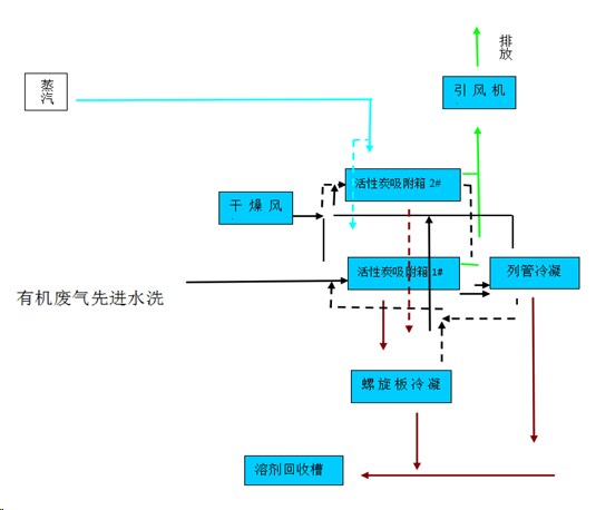 3、對(duì)于非水溶性有機(jī)溶劑,采用活性炭吸附-蒸汽脫附-溶劑回收,具有相變熱高,脫附完全,易冷凝的優(yōu)點(diǎn),可實(shí)現(xiàn)有機(jī)溶劑和水的自動(dòng)有效分離。