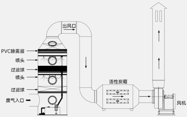 有機廢氣首先通過水噴淋塔進行洗浴凈化,去除部分可溶性氣體和顆粒物。