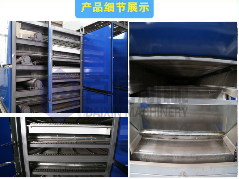 被加工物料采用多層移動式不銹鋼網帶傳送,熱氣流自下而上穿流網帶及其上的物料層,多層新歡翻轉,逐層烘干,熱質交換均勻、充分,生產效率高,產品質量好。